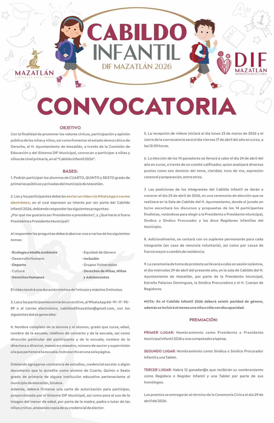 Mazatlán, Sinaloa, 23 de marzo de 2026.-Con el objetivo de fomentar los valores cívicos, la participación ciudadana y la expresión de la niñez, el Gobierno Municipal, que dirige la Presidenta Estrella Palacios Domínguez, a través del Sistema DIF Mazatlán, lanzó la convocatoria para integrar el Cabildo Infantil 2026. La invitación está dirigida a alumnas y alumnos de cuarto, quinto y sexto grado de primaria, tanto de escuelas públicas como privadas del municipio, quienes podrán participar enviando un video donde expresen su interés por formar parte de este ejercicio democrático.