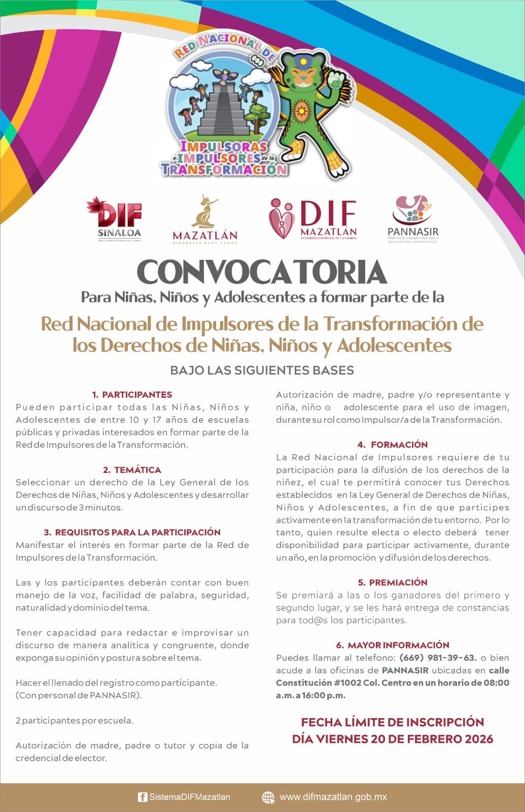Mazatlán, Sinaloa, 5 de febrero de 2026.– El Sistema DIF Sinaloa, a través de DIF Mazatlán, en coordinación con PANNASIR, invitan a niñas, niños y adolescentes de entre 10 y 17 años, a sumarse a la convocatoria para integrar la Red Nacional de Impulsores de la Transformación de los Derechos de Niñas, Niños y Adolescentes.